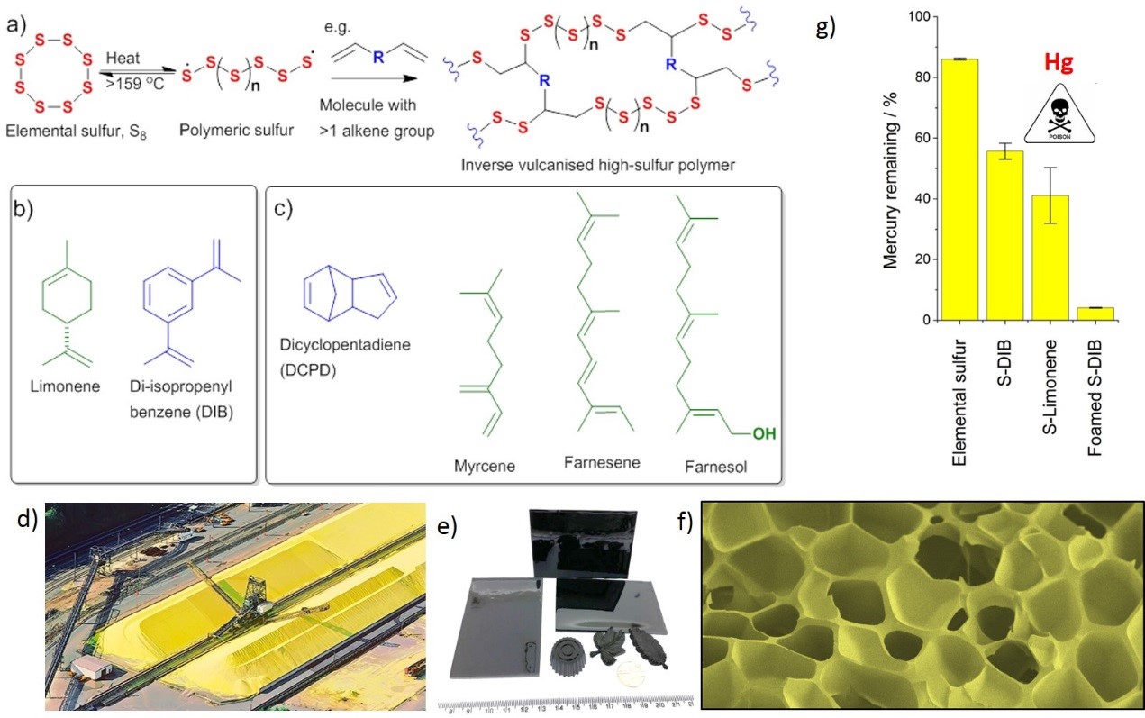 Figure 1: a) Reaction of elemental sulfur and organic crosslinkers produces stable polymers with up to 80 weight % sulfur. b) Previously reported crosslinkers, di-isopropenyl benzene[1] and limonene[2]. c) Alternative crosslinkers reported here.[4] This allows excess elemental sulfur waste, d), to be converted to functional materials, e). These high sulfur polymers can then be foamed in supercritical CO2 to increase the accessible surface, as shown by SEM, f), which significantly increases their ability to capture mercury from solution, g).[3]