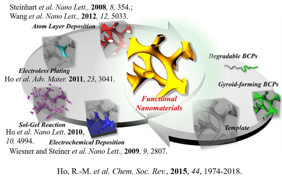 The design of nanostructured materials and their corresponding morphologies has attracted intense attention. Although many technologies have been explored to fabricate nanostructured materials, templated synthesis is one of the most important approaches to fabricate nanostructured materials with precisely controlled structures and morphologies from their constituent components. Here, we aim to use the self-assembly of block copolymers as an emerging and powerful tool to fabricate well-defined nanomaterials with precise control over the structural dimensions and shape, as well as over the composition and corresponding spatial arrangement. Consequently, the fabrication of well-ordered nanoporous polymers can be achieved by using the self-assembly of block copolymers composed of degradable block with gyroid-forming network morphologies as templates for the syntheses of various materials with different entities. Different templated syntheses are developed for the fabrication of nanoporous polymeric, metal oxide and metallic materials. By taking advantage of the well-ordered structural characteristics of the gyroid texture, the properties and applications of 3D regular nanostructures, such as optical properties, catalytic, plasmonic and photonic behavior as well as energy storage of gyroid-forming nanostructures, are demonstrated so as to prove the design concepts of metamaterials.