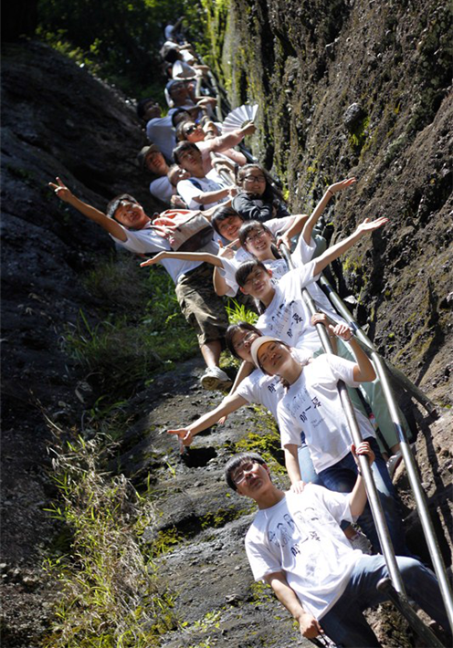 第三日,我们穿上了齐行为我们准备的“班服”。路过连城县城,同学们下车买了散装的饼干、面包和矿泉水等用作中午野餐的食物。我们的既定游览路线是从一线天的线路登上长寿亭,在长寿亭野餐和午休,然后换一条路线下山,结束一天愉快行程。结果下山的时候,同学们走错了路线,选择了一条最艰险的山路!还好在大家的互相鼓励和帮助下,终于全员安全回到了山脚下。在在这里要感谢颇具绅士风度的化生班男生们,他们负责了所有的干粮和水。为了减轻负担,还帮所有女生背了背包,强大的化生班男生们!